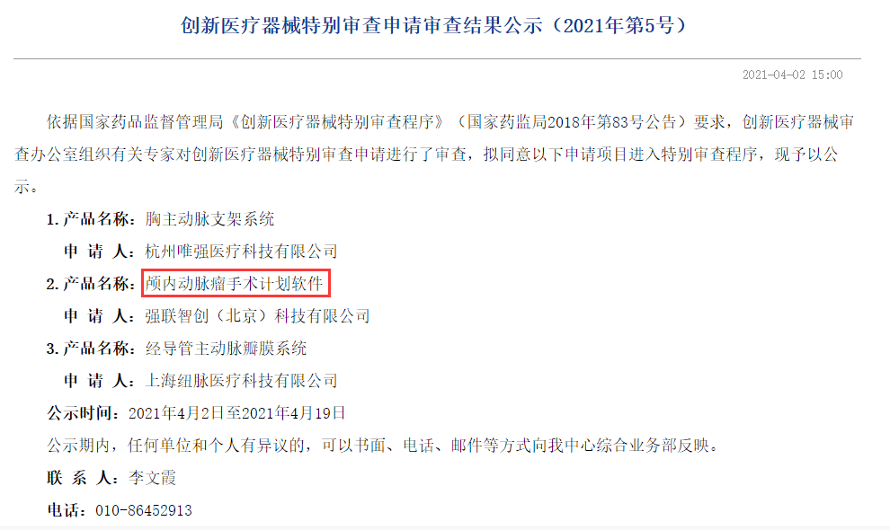 依據(jù)國家藥品監(jiān)督管理局《創(chuàng)新醫(yī)療器械特別審查程序》(國家藥監(jiān)局2018年第83號公告)要求,創(chuàng)新醫(yī)療器械審查辦公室組織有關(guān)專家對創(chuàng)新醫(yī)療器械特別審查申請進(jìn)行了審查,擬同意以下申請項(xiàng)目進(jìn)入特別審查程序,現(xiàn)予以公示。
