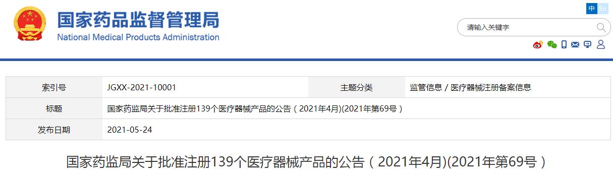 國家藥監(jiān)局關(guān)于批準(zhǔn)注冊139個醫(yī)療器械產(chǎn)品的公告(2021年4月)(2021年第69號)