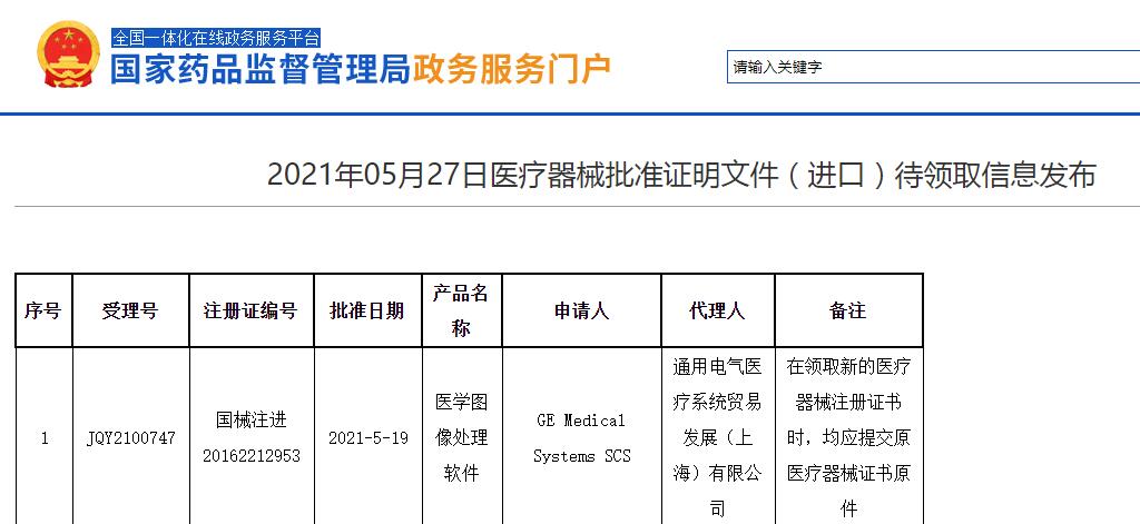 根據(jù)國家藥監(jiān)局官網(wǎng)發(fā)布的《2021年05月27日醫(yī)療器械批準(zhǔn)證明文件(進(jìn)口)待領(lǐng)取信息發(fā)布》消息可知,法國公司GE Medical Systems SCS(通用電氣醫(yī)療系統(tǒng)兩合公司)的醫(yī)學(xué)圖像處理軟件延續(xù)注冊在5月19日批準(zhǔn)注冊,其注冊號為國械注進(jìn)20162212953。