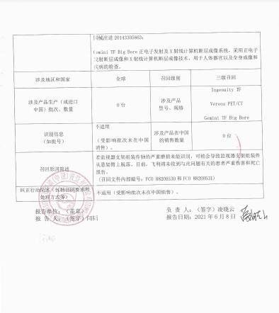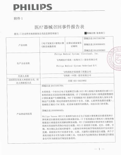飛利浦(中國(guó))投資有限公司報(bào)告,由于涉及特定型號(hào)、特定批次產(chǎn)品,存在若監(jiān)視器支架組裝件軸的嚴(yán)重磨損未能識(shí)別,可能會(huì)導(dǎo)致監(jiān)視器支架組裝件從懸架臂上脫落的問(wèn)題,生產(chǎn)商Philips Medical Systems(Cleveland), Inc飛利浦醫(yī)療系統(tǒng)(克利夫蘭)股份有限公司對(duì)正電子發(fā)射及X射線計(jì)算機(jī)斷層成像系統(tǒng)PET/CT Imaging System(注冊(cè)證號(hào):國(guó)械注進(jìn)20143305863、國(guó)械注進(jìn)20173301760、國(guó)械注進(jìn)20183060453)主動(dòng)召回。召回級(jí)別為三級(jí)。涉及產(chǎn)品的型號(hào)、規(guī)格及批次等詳細(xì)信息見(jiàn)《醫(yī)療器械召回事件報(bào)告表》。