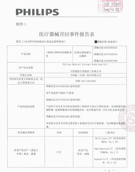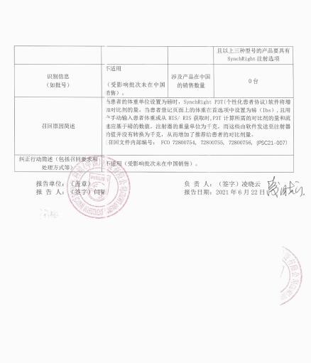 飛利浦(中國(guó))投資有限公司報(bào)告,由于涉及特定型號(hào)、特定批次產(chǎn)品,存在當(dāng)患者的體重單位設(shè)置為磅時(shí),SynchRight P3T(個(gè)性化患者協(xié)議)軟件將增加對(duì)比劑量的問(wèn)題,生產(chǎn)商飛利浦醫(yī)療系統(tǒng)荷蘭有限公司Philips Medical Systems Nederland B.V.對(duì)X射線計(jì)算機(jī)體層攝影設(shè)備Computed Tomography System(注冊(cè)證號(hào):國(guó)械注進(jìn)20153060422、國(guó)械注進(jìn)20173302330、國(guó)械注進(jìn)20163061984)主動(dòng)召回。召回級(jí)別為三級(jí)。涉及產(chǎn)品的型號(hào)、規(guī)格及批次等詳細(xì)信息見(jiàn)《醫(yī)療器械召回事件報(bào)告表》。