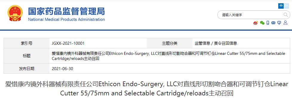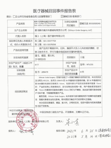 愛惜康內(nèi)鏡外科器械有限責(zé)任公司Ethicon Endo-Surgery, LLC對(duì)直線形切割吻合器和可調(diào)節(jié)釘倉(cāng)強(qiáng)生(上海)醫(yī)療器材有限公司報(bào)告,由于涉及特定型號(hào)、特定批次產(chǎn)品,存在包裝內(nèi)直線形切割吻合器和釘倉(cāng)不兼容的問(wèn)題,生產(chǎn)商愛惜康內(nèi)鏡外科器械有限責(zé)任公司Ethicon Endo-Surgery, LLC對(duì)直線形切割吻合器和可調(diào)節(jié)釘倉(cāng)Linear Cutter 55/75mm and Selectable Cartridge/reloads(注冊(cè)證號(hào):國(guó)械注進(jìn)20152020243)主動(dòng)召回。召回級(jí)別為三級(jí)。涉及產(chǎn)品的型號(hào)、規(guī)格及批次等詳細(xì)信息見《醫(yī)療器械召回事件報(bào)告表》。