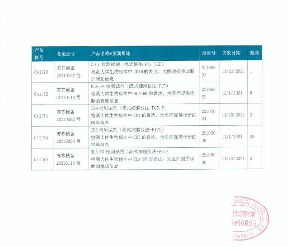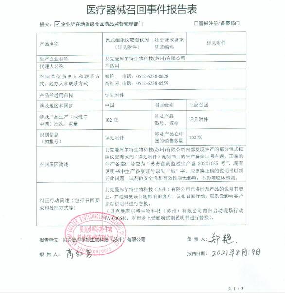 貝克曼庫爾特生物科技(蘇州)有限公司報告,該企業(yè)內(nèi)部發(fā)現(xiàn)生產(chǎn)的部分流式細(xì)胞儀配套試劑說明書的生產(chǎn)備案證號有誤,與試劑的安全性和有效性無關(guān),現(xiàn)主動召回,召回級別為三級。涉及產(chǎn)品的具體信息見《醫(yī)療器械召回事件報告表》