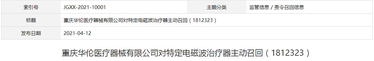 由于特定電磁波治療器設(shè)備不滿足“正常使用時設(shè)備傾斜10°不失衡”的要求等原因,重慶華倫醫(yī)療器械有限公司對其生產(chǎn)的特定電磁波治療器(注冊或備案號:渝械注準20162260108)主動召回。召回級別為三級。涉及產(chǎn)品的型號、規(guī)格及批次等詳細信息見《醫(yī)療器械召回事件報告表》。