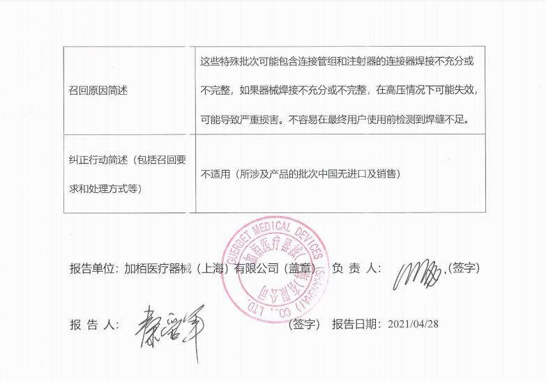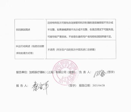 加?xùn)噌t(yī)療器械(上海)有限公司報(bào)告,由于涉及特定型號(hào)、特定批次產(chǎn)品可能存在連接器焊接不充分或不完整,在高壓情況下可能失效,導(dǎo)致嚴(yán)重?fù)p害的問(wèn)題,生產(chǎn)商理博有限公司/ Liebel-Flarsheim Company LLC對(duì)一次性使用高壓注射器及附件Disposables Associated with Power Injectors(注冊(cè)證號(hào):國(guó)械注進(jìn)20173156266)主動(dòng)召回。召回級(jí)別為二級(jí)。涉及產(chǎn)品的型號(hào)、規(guī)格及批次等詳細(xì)信息見(jiàn)《醫(yī)療器械召回事件報(bào)告表》。
