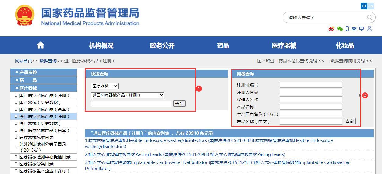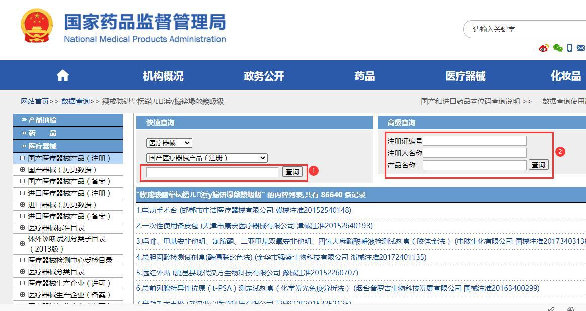 3、看【圖2】,如果你查詢的醫(yī)療器械是國產(chǎn)的,那么你就點(diǎn)擊①;如果你查詢的醫(yī)療器械是進(jìn)口的那就選擇②。