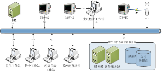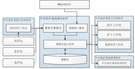 中央監(jiān)護(hù)軟件一般由“中央監(jiān)護(hù)服務(wù)軟件、中央監(jiān)護(hù)工作站軟件、中央監(jiān)護(hù)管理軟件”組成:
